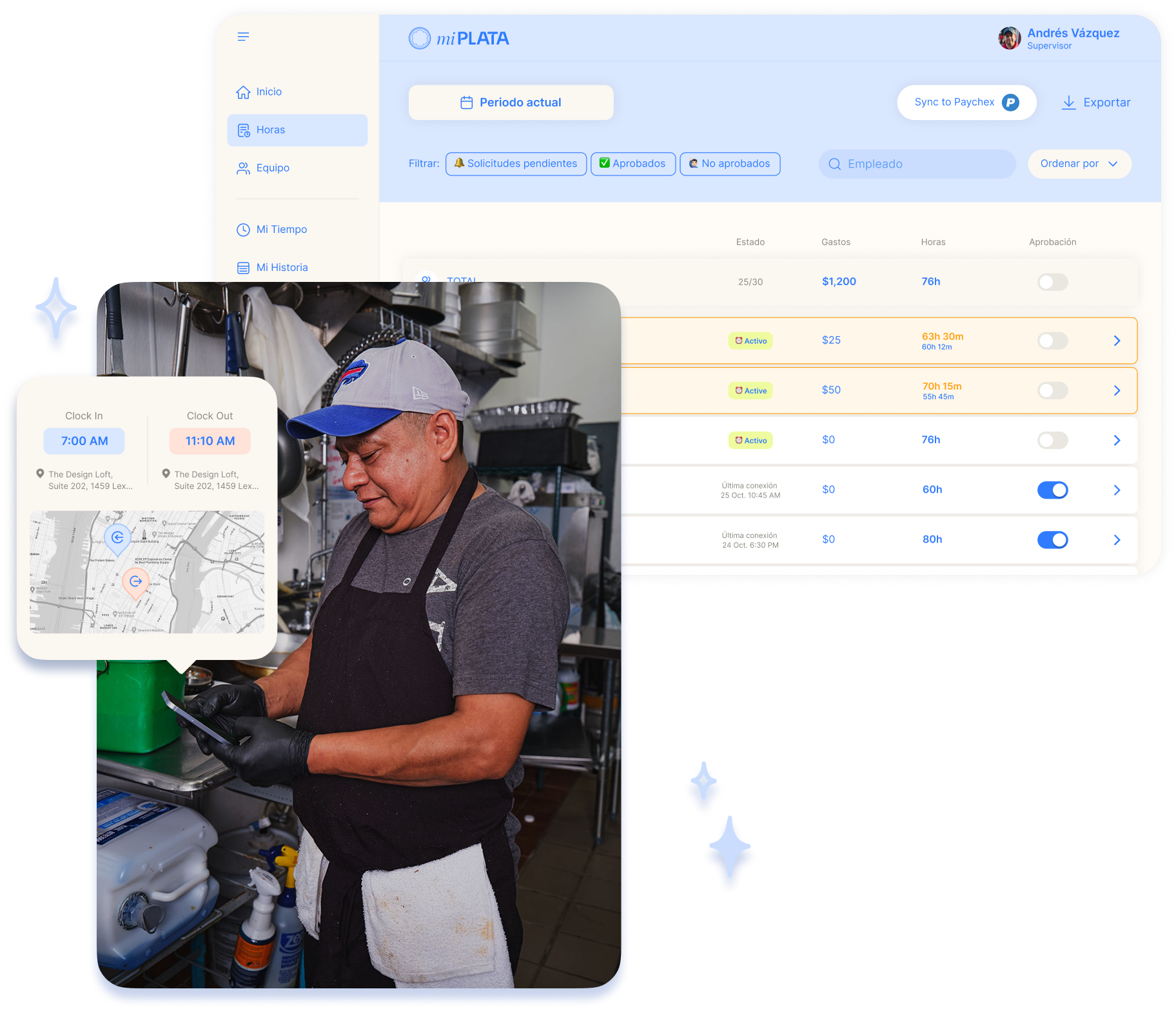 - Integrates seamlessly with miPlata Time or your current time and payroll systems